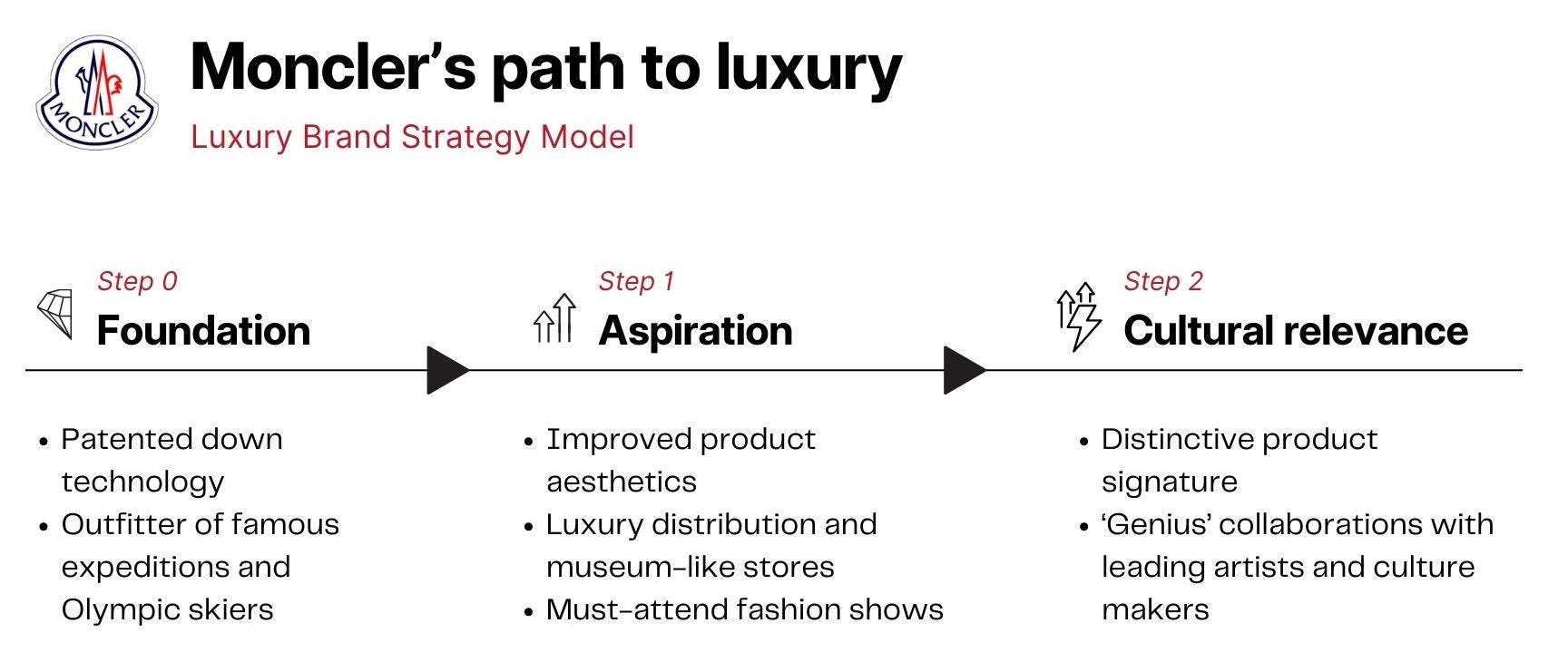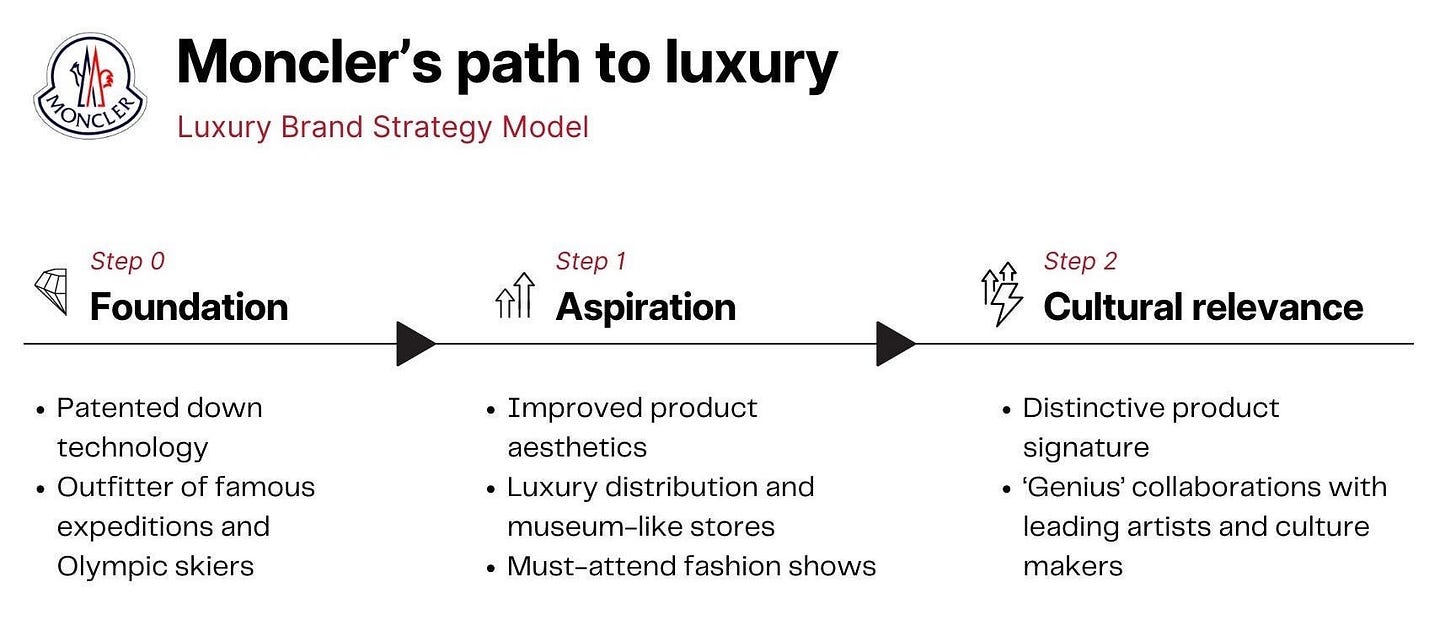 From there, Ruffini set about transitioning Moncler from Olympic ski jacket to luxury fashion. I organized Ruffini’s strategy into a new framework: the Luxury Brand Strategy model. It’s simple, with only two phases (three if you are starting from scratch) to allow for a focus on outcomes and flexibility in execution.