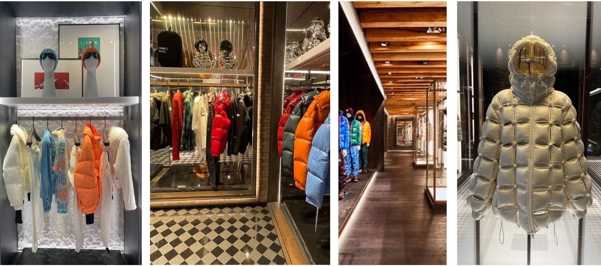 Today, Moncler stores feel more like museums than retailers. Each corner of the Moncler in Manhattan’s Soho neighborhood features a different style of jacket and accompanying accessories. A few extraordinary coats are showcased behind glass, while a lack of windows and ornate interior design bring guests on a trip to an alternate Moncler universe.