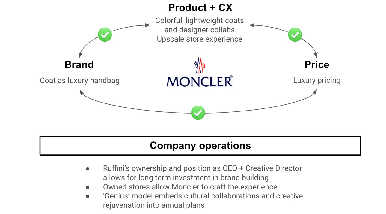 Brand, Product, Price <> Operations: Most importantly, Moncler supports their brand strategy with an aligned operating model. Ruffini’s ownership allows for a longterm focus on brand-building instead of short-term sales. Owned stores allow Moncler to craft the experience themselves, while the Genius model entrenches creative refreshment into the brand. The product portfolio both maintains exclusivity with high end coats, while bringing in customers with high margin consolation items like scarves and perfume.