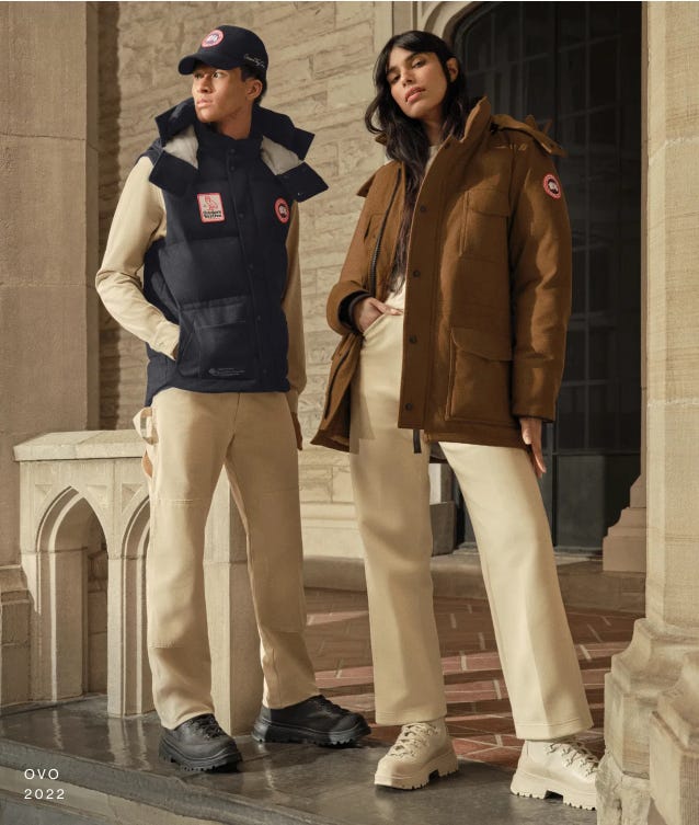 Canada Goose also has collaborations, but their lack of product signature limits their potency. There is no obvious point of view that ties them together. Canada Goose’ various collaborations with Drake’s OVO (October’s Very Own) feel disjointed and lazy, while Feng Chen Wang’s more creative Canada Goose collection lacks a visual tie to the brand.