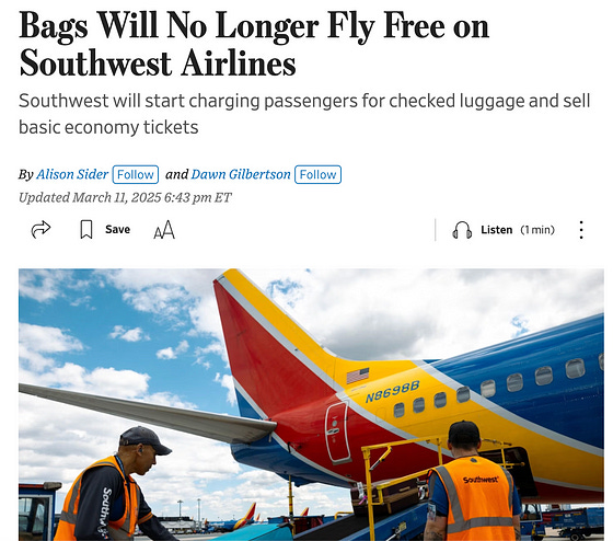 Southwest plans to start charging for checked bags, a seismic shift that will boost revenue but potentially give its fiercely loyal passengers a reason to shop around. — WSJ